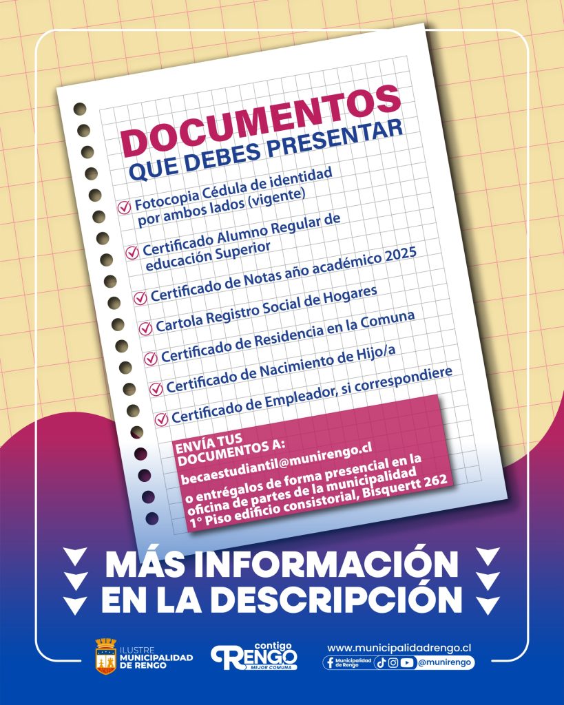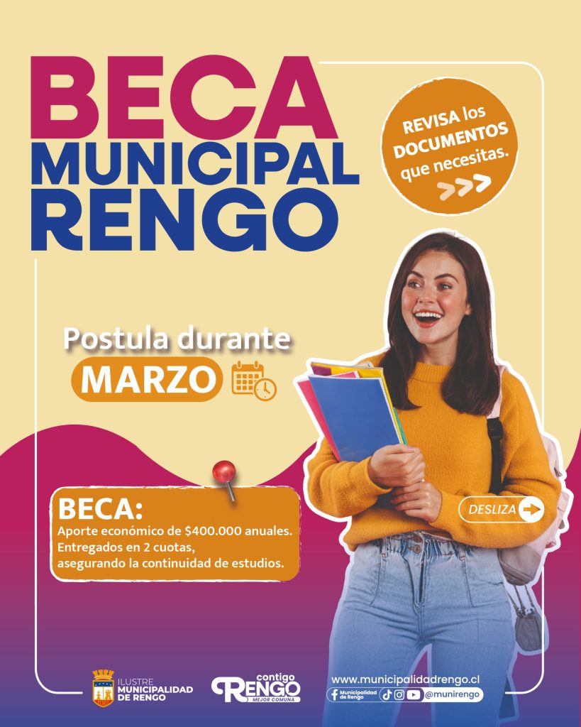 La Beca Municipal Rengo consiste en un aporte económico único de $400.000, entregado en el mes de mayo. Este beneficio busca apoyar el esfuerzo académico de las y los estudiantes de nuestra comuna y promover la igualdad de oportunidades.